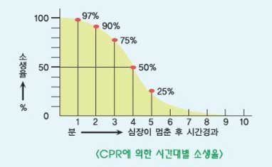 심폐소생술에 의한 시간대별 소생율에 의하면 119도착전 최초발견자의 신속한 심폐소생술 시행이 중요합니다.