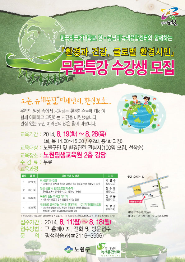 ■ 교육기간 : 2014. 8. 19(화) ~ 8. 28(목) <화,목 14:00~15:30 / 주2회, 총4회 과정> ■ 교육대상 : 노원구민 및 환경관련 관심자(100명 모집, 선착순) ■ 교육장소 : 노원평생교육원 2층 강당 ■ 수 강 료 : 무료 ■ 강 사 진 : 한국외대 중남미연구소 한․중남미녹색융합센터 교수진 ■ 접수기간 : 2014. 8. 11(월) ~ 8. 18(월) ■ 접수방법 : 구 홈페이지, 전화 및 방문접수 ■ 문 의 처 : 노원구청 평생학습과(☎02-2116-3996)