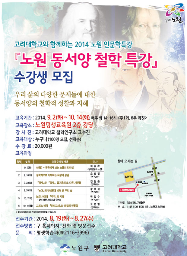 ■ 교육기간 : 2014. 9. 2(화) ~ 10. 14(화) <매주 화 14~16시 / 주1회, 6주 과정> ■ 교육장소 : 노원평생교육원 2층 강당 ■ 강 사 진 : 고려대학교 철학연구소 교수진 ■ 교육대상 : 누구나(100명 모집, 선착순) ■ 수 강 료 : 20,000원 ■ 접수기간 : 2014. 8. 19(화) ~ 8. 27(수) ■ 접수방법 : 구 홈페이지, 전화 및 방문접수 ■ 문 의 처 : 노원구청 평생학습과(☎02-2116-3996)
