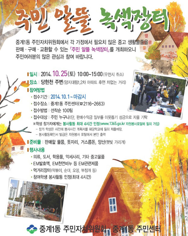 각 가정에서 사용하지 않고 보관중인 의류,신발,도서, 장난감, 악세사리 등 물품을 판매 및 교환하는 주민알뜰녹색장터를 10월 25일 토요일 10시부터 오후3시까지 양지대림1,2차아파트 뒤 차없는 거리에서 개장합니다. 주민여러분의 많은 참여와 이용을 부탁드립니다.
