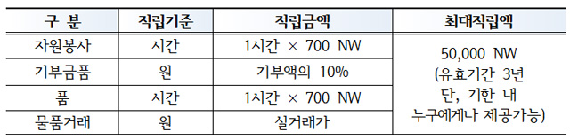 ○ 기부금품 : 개인이나 단체가 이해관계 없는 어려운 이웃이나 단체를 위해 일정한 금액을 노원구청이나 노원교육복지재단을 통해 사회복지공동모금회에 제공하는 금전이나 물품 또는 자원순환을 위해 녹색장터 되살림에 제공하는 일정한 물품 (1,000원 = 100NW)