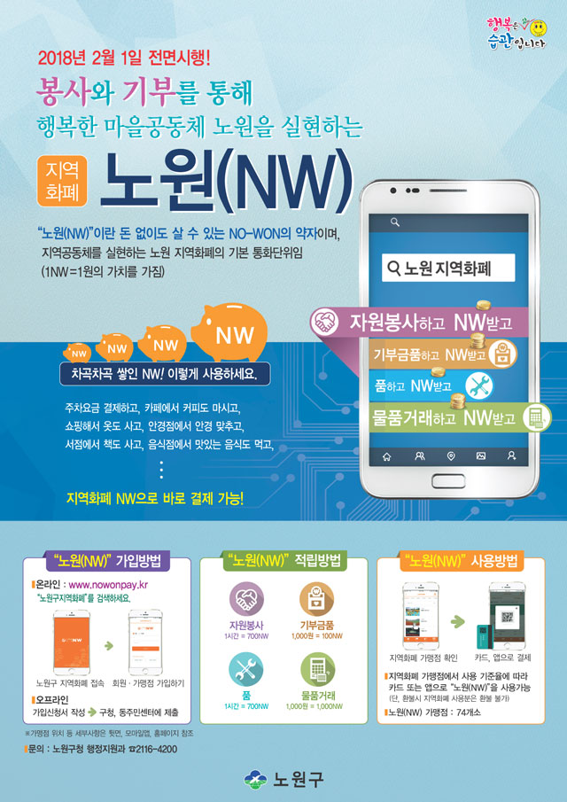▶ “노원(NW)”이란 돈 없이도 살 수 있는 NO-WON의 약자이며, 지역공동체를 실현하는 노원 지역화폐의 기본 통화단위 (1NW=1원의 가치를 가짐)