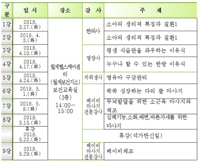 노원구에서는 영유아 및 산모를 대상으로 한의약건강교실을 실시합니다. 영유아와 산모의 한의약적 건강관리법 강좌를 통하여 구민의 건강을 증진하고자 하니 많은 참여바랍니다.