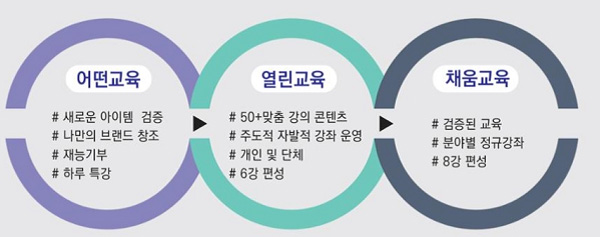⋄ 강사활동지원 : 어떤 교육은 재능기부형태로 진행, 강좌홍보, 강의실 제공, 커뮤니티 결성지원