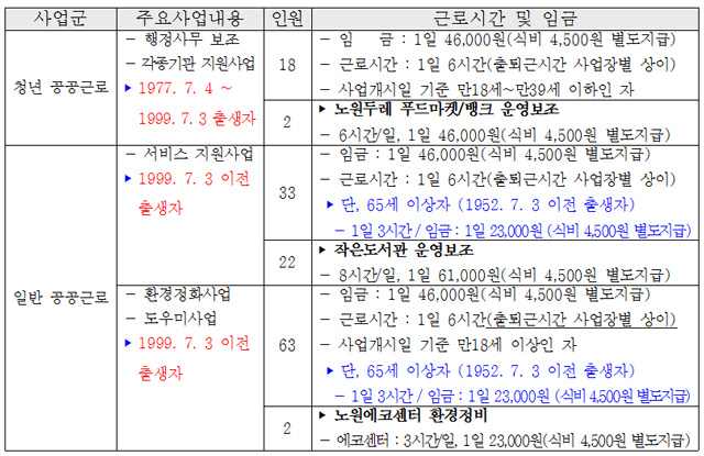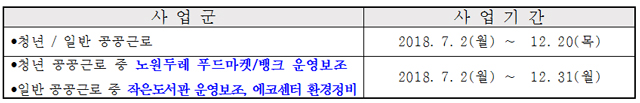 ▶ 모집기간 : 2018. 5. 8(화) ~ 5. 25(금)[13일간] 09:00~18:00 ▶ 모집인원 : 150명 (※선정인원은 사정에 따라 변경될 수 있음) ▶ 신청방법 : 주민등록 주소지 동 주민센터 방문신청 ▶ 모집분야 및 근로조건 (별첨. 사업내역 참조)