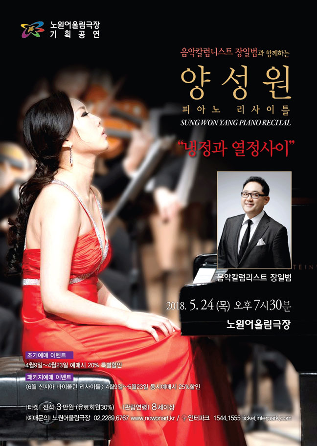 ▶ 공 연 명 : 음악칼럼니스트 장일범과 함께하는 양성원 피아노 리사이틀 <냉정과 열정사이> ▶ 공연일시 : 2018. 5. 24.(목) 19:30 ▶ 공연장소 : 노원어울림극장 ▶ 관 람 료 : 전석 3만원 ▶ 할인정보 : 노원문화예술회관 유료회원 30%, 학생(대학생포함) 20%, 다둥이 10%, 국가유공자·장애우·기초생활수급자·경로(만65세이상)50% ▶ 공연내용 : 독일과 유럽을 중심으로 연주활동을 펼쳐온 최근 가장 핫한 피아니스트 양성원과 KBS클래식FM '장일범의 가정음악‘의 정겨운 목소리 장일범이 해설을 더한 명품 클래식 피아노 리사이틀 ▶ 예매문의 : 노원문화예술회관 홈페이지 예매, ☎ 02-2289-6767