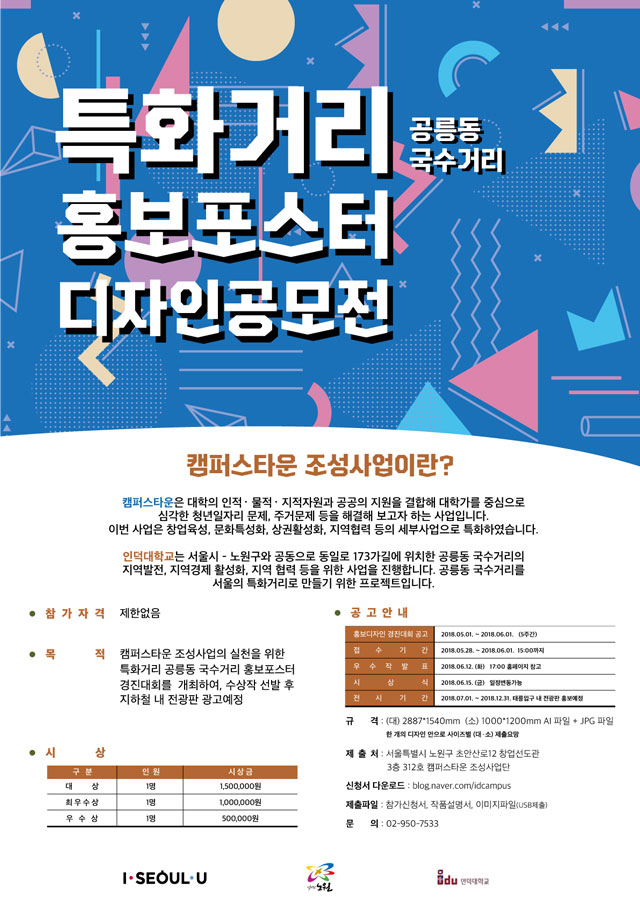 인덕대 캠퍼스타운 「청년창업거리 1·7·3 프로젝트」사업과 관련하여 공릉동 국수거리(특화거리) 홍보포스터 디자인을 공모합니다. 관심있는 구민 여러분들의 많은 관심과 참여 부탁드립니다.