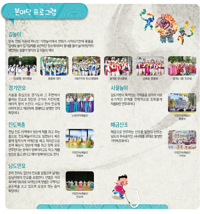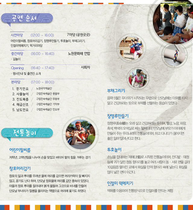 우리 명절인 “단오”를 맞이하여 각종 전래놀이 체험 및 관내 민속 단체들의 공연을 준비하였습니다. 관심있는 구민 여러분의 많은 참여 부탁드립니다.