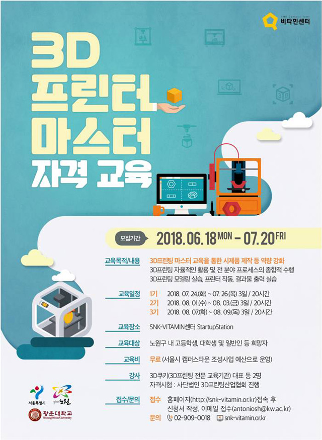 광운대 캠퍼스타운 「지역 공존·공감 창조경제 캠퍼스타운 조성」사업과 관련입니다. 4차산업혁명 시대의 주요 이슈 중 하나인 3D프린터의 활성화와 창업가들의 시제품 제작 역량을 높이기 위해, 관내 구민들을 대상으로 3D프린터 마스터 자격 교육을 실시합니다. 관심있는 구민 여러분들의 많은 신청 바랍니다.
