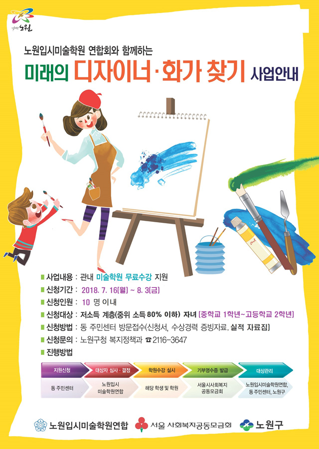 노원구 관내 저소득가구 청소년들이 자신의 미술적 재능을 꽃피울 수 있도록, 미술입시학원을 무료로 수강하게 될 신규 모집 대상자를 모집합니다. 수강 희망자는 동 주민센터에 신청하여 주시기 바랍니다.