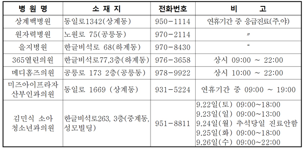 ☞ 연휴기간 중 일자별 진료기관 및 약국 문의 : 국번없이 119, 120 또는 노원구보건소(☏ 2116-4501, 야간 2116-3000) ※ 상황에 따라 진료기관 등이 변경될 수 있으니 전화확인 후 이용하시기를 바랍니다.