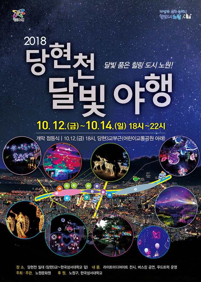 당현천의 자연경관과 LED조명을 활용한 라이트쇼, 각종 조형물 전시, 축하공연 등이 펼쳐지는 2018 당현천 달빛야행! 가족·친구와 함께 당현천 달빛 아래, 깊어가는 가을 밤을 느껴보시길 바랍니다.