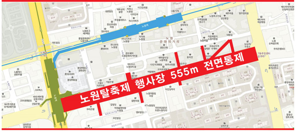 - 일 시 : 2018. 10. 26.(금) 09:00 ~ 10. 28.(일) 04:00- 해당노선 : 시내버스 1132번, 1167번, 마을버스 노원05번- 통제구간 : 롯데백화점 ↔ 순복음교회 앞(노해로 일대) - 무정차 정류소 구간○ 1132번 : 와우패션클럽 ~ 롯데백화점○ 1167번 : 대림아파트상가 ~ KT전화국 (불암중학교 방향)와우패션클럽 ~ 도봉면허시험장 (우이동 종점 방향)○ 노원05번 : 7호선노원역 ~ 메이다이산부인과(온곡초 방향) / 주유소앞 ~ 롯데백화점(창동방향)