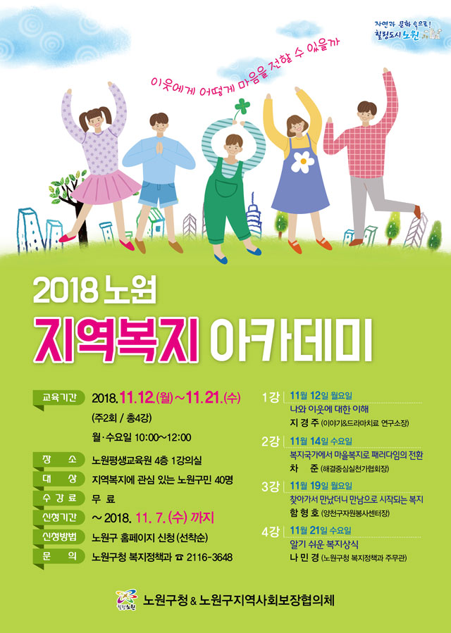 노원 지역복지 아카데미는 지역복지에 관심이 있는 구민 누구나 참여할 수 있으며, 총 4강으로 구성되어 있습니다. 지역 주민의 복지에 대한 이해와 관심을 통해 사람의 온기로 따뜻한 노원을 만들고자 운영하고 있으니 많은 관심과 참여 바랍니다.