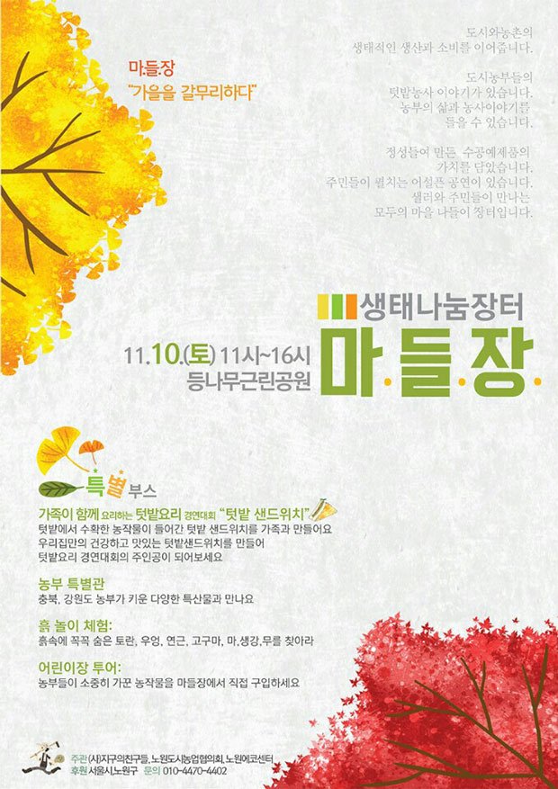 노원에코센터에서는 도시의 생태적인 생산과 소비를 이어주기위해 노원지역 주민, 시민사회단체가 참여하는 생태·환경장터 마.들.장(마을에서 만나는 나들이 장터) 행사를 실시합니다~. 관심있는 분들의 많은 참여 부탁드립니다.