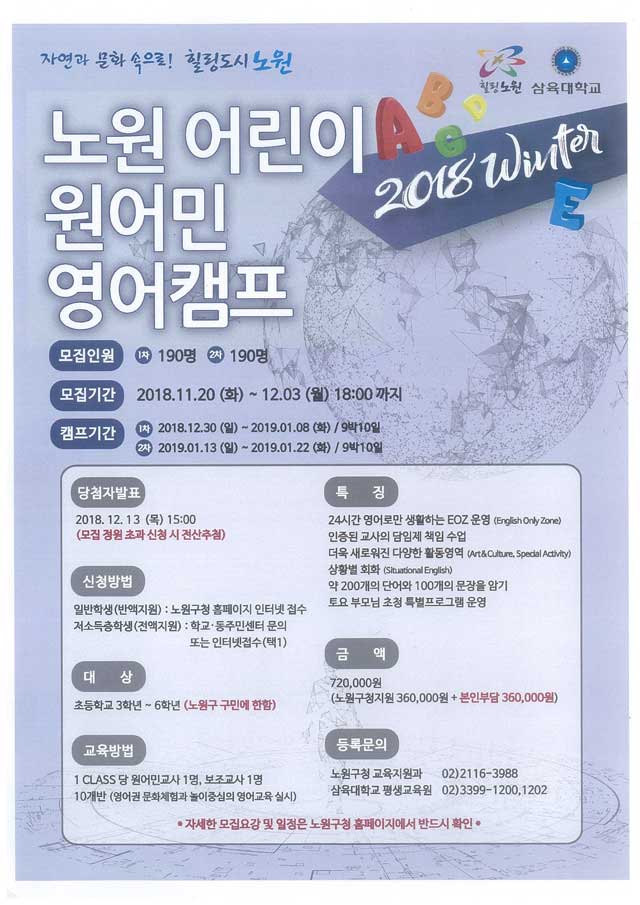 노원구에서는 겨울방학을 맞이하여 관내 삼육대학교와 관학협력 사업으로 『2018학년도 겨울방학 노원 어린이 원어민 영어캠프』를 개최합니다. 해외연수에 버금가는 영어환경에서 원어민 강사와 다양한 활동을 하며 영어를 학습할 수 있는 이번 행사를 통해 알차고 보람 있는 겨울방학을 보내시기 바랍니다.~~!!