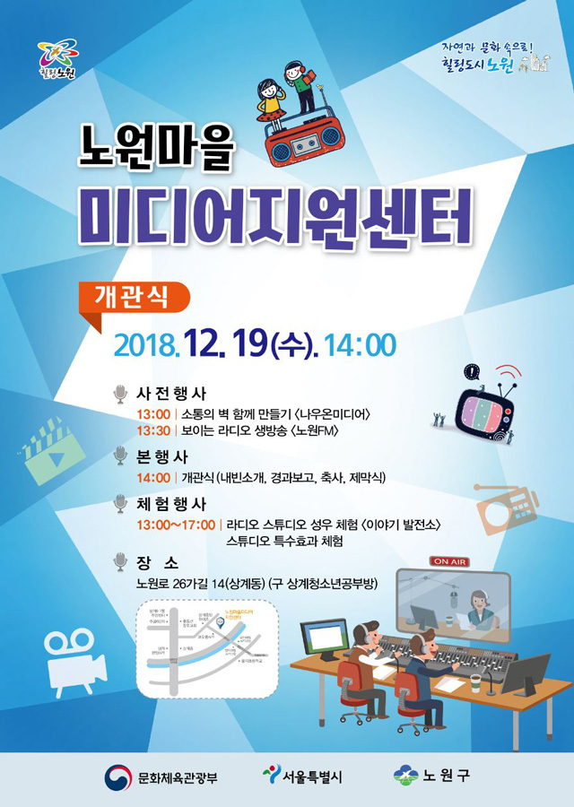 우리 구민들의 마을미디어 활동을 지원하는 노원마을미디어지원센터 가 건립을 마치고, 12월19일 오후2시 개관식을 개최합니다. 마을미디어를 통해 소통하는 행복한 노원! 그 출발을 함께 축하해주세요~