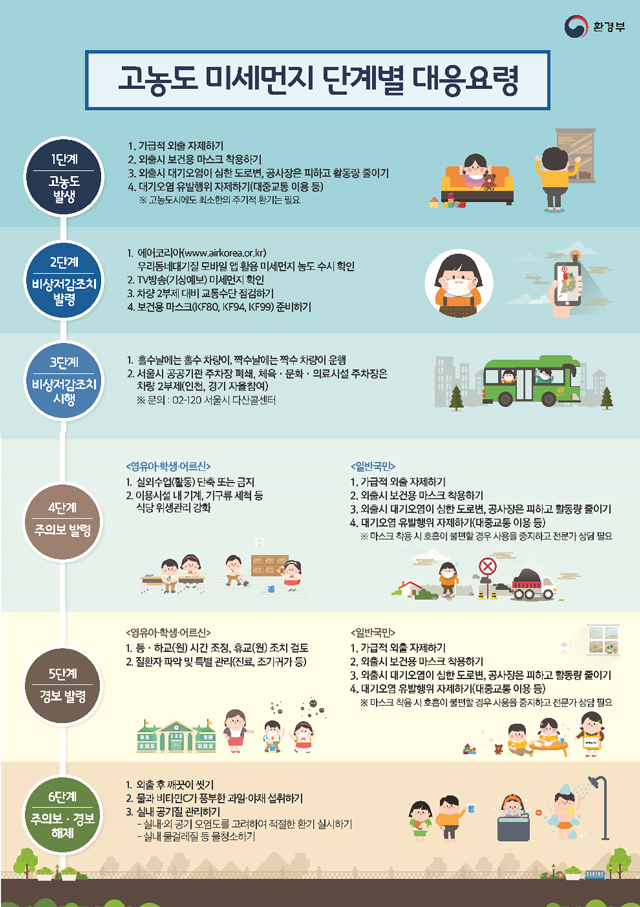 고농도 미세먼지 발생시, 일반국민도 쉽게 행동 할 수 있는 미세먼지대응 요령 입니다. ▼ 노약자, 호습기 질환자, 심혈관질환자는 외출을 삼가하여 주시기 바랍니다. ▼ 일반시민께서는 과격한 실외운동, 외출 등을 자제하여 주시기 바랍니다. ▼ 대기오염 저감을 위하여 불요불급한 차량운행을 자제하고 대중교통을 이용하여 주시기 바랍니다. ▼ 공사장이나 먼지를 배출하는 사업장에서는 가급적 조업시간을 단축하여 미세먼지 저감에 협조 바랍니다.