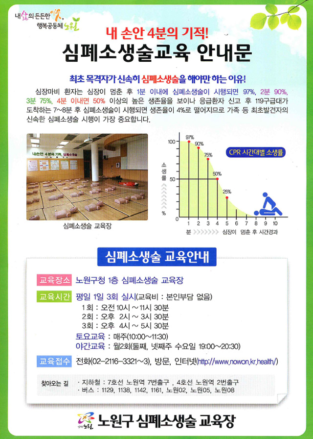 곁에 있는 가족이나 동료 및 행인들 즉, 최초목격자가 골든타임 4분이내에 심폐소생술을 신속히 시행하면 후유증 없이 소생이 가능합니다! 그래서 심폐소생술 교육이 꼭 필요한 것입니다.