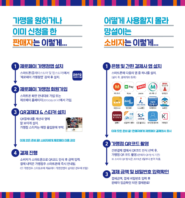 판매자는 가맹점에 가입을 하고 소비자는 별도의 제로페이 앱을 설치하는 것이 아닌 제로페이에 참여하는 간편결재 앱을 설치 후 이용. (이미 설치된 사용자는 기존 앱 이용)