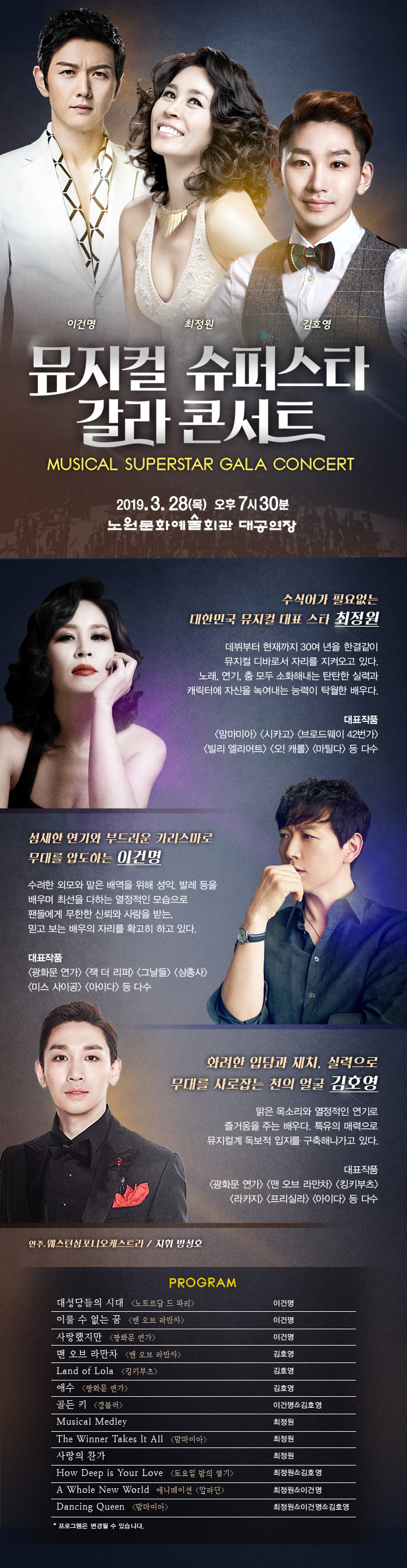 ▶ 공연일정 : 2019. 3. 28.(목) 오후 7:30▶ 공연장소 : 노원문화예술회관 대공연장▶ 장르 : 뮤지컬▶ 관람료 : R석 7만원, S석 6만원, A석 4만원 (유료회원 30% 할인)▶ 관람연령 : 8세 이상▶ 문의 : 노원문화예술회관 ☎ 02-2289-6830