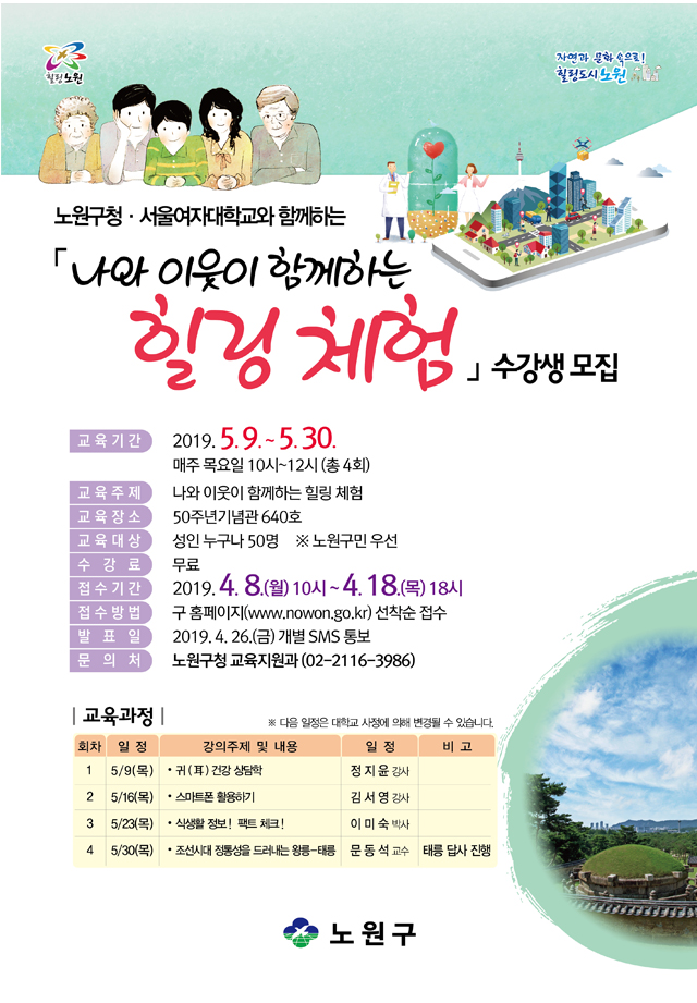 ▶ 접수기간 : 2019. 4. 8.(월) 10:00 ~ 4. 18.(목) 18:00 ▶ 접수방법 : 구청 홈페이지 선착순 접수▶ 문의 : 교육지원과 ☎ 02-2116-3986 ☞ 신청하기 (클릭하세요)