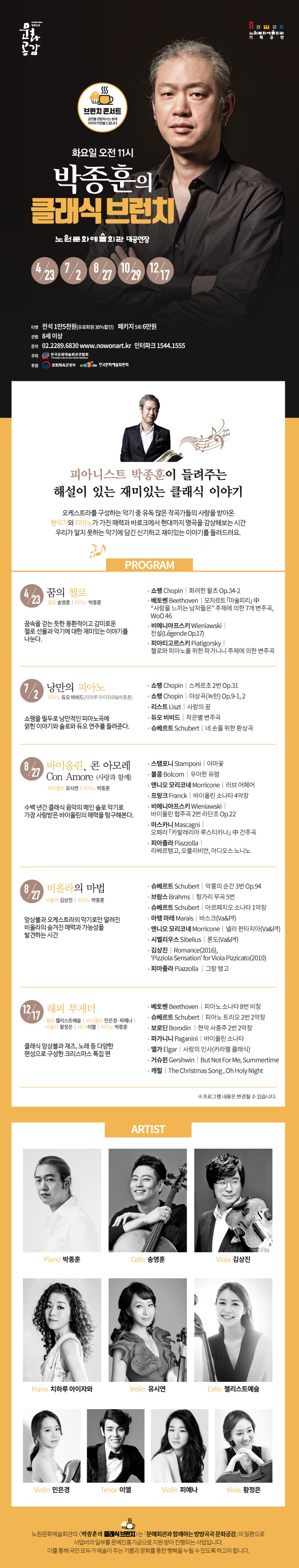 ▶ 공연일시 : 2019. 4. 23.(화) 오전 11시 ▶ 장소 : 노원문화예술회관 대공연장▶ 티켓 : 전석 1만5천원 (패키지 5회 6만원)▶ 장르 : 클래식▶ 관람연령 : 8세 이상▶ 문의 : 노원문화예술회관 ☎ 02-2289-6830 ※ 공연을 관람하시는 분께 커피 와 머핀 을 드립니다! ※ 2019 공연일정 : 4/23, 7/2, 8/27, 10/29. 12/17 (패키지티켓 5회 6만원)