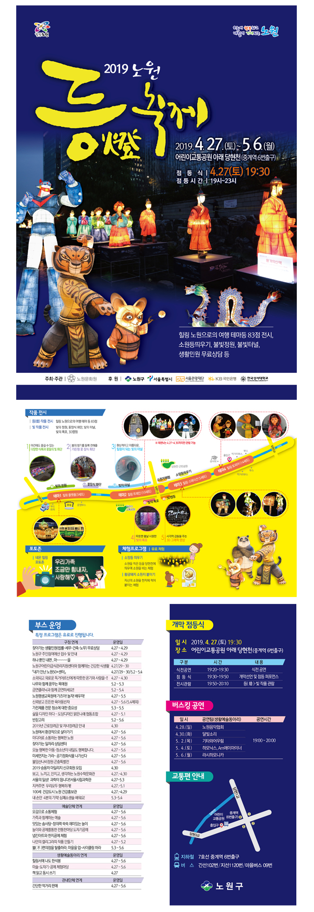 ▶ 기간 : 2019. 4. 27.(토) ~ 5. 6.(월) , 10일간 (19:00~23:00 점등) ▶ 장소 : 당현천 (당현3교 ~ 한국성서대학교) 약 630m 구간 ※ 개막 점등식 : 4. 27(토) 19:30, 어린이교통공원 아래 ▶ 체험프로그램 : 소원 등 띄우기, 소원지 붙이기, 예술단체 연계프로그램 등▶ 기타 : 생활민원 무료상담, 푸드트럭 등▶ 문의 : 문화예술과 ☎ 02-2116-3772