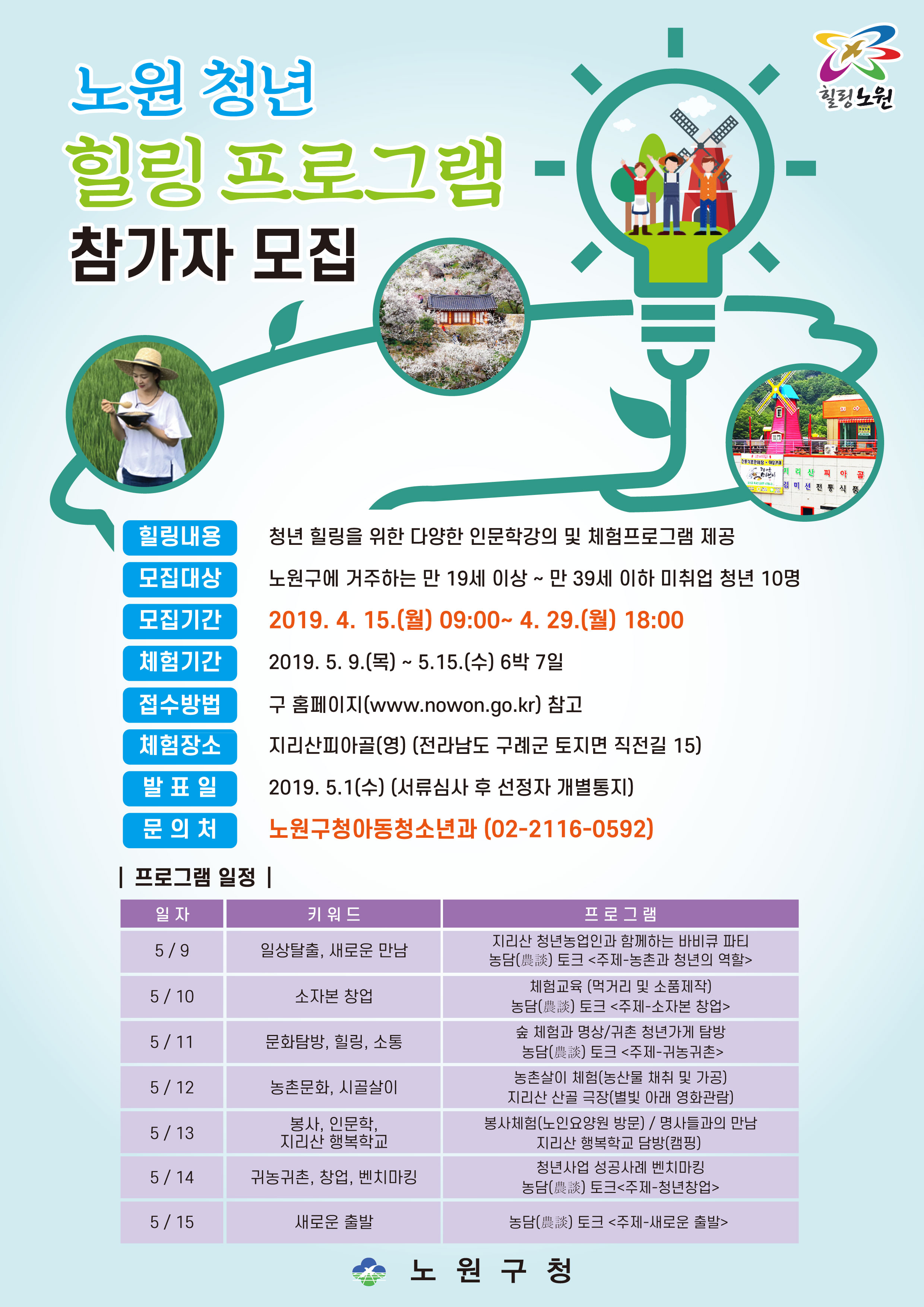노원구에서는 후기 청소년 및 청년에게 잠시 쉬어가는 힐링 프로그램을 운영하여 삶을 설계 할 수 있는 기회를 제공하기 위해「노원 청년 힐링 프로그램」참여자를 모집하오니 많은 지원 바랍니다.