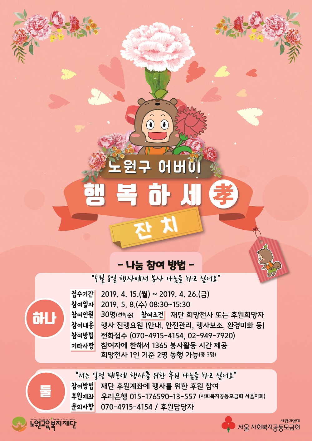 어버이날을 맞이하여 노원교육복지재단에서 준비한 관내 만65세 어르신을 위한 노원구 어버이 행복하세孝 잔치에 봉사 또는 후원으로 참여를 원하시는 대상자를 모집하고 있으니 관심있는 분들의 많은 참여 부탁드립니다. ▶ 일시 : 2019. 5. 8.(수) 11:00 ~ 14:00 ▶ 장소 : 상계근린공원, 상경초 운동장 (상계근린공원 옆)▶ 행사내용 : 문화공연, 기념식, 오찬제공, 체험부스 운영 등▶ 문의 : ☎ 070-4915-4154