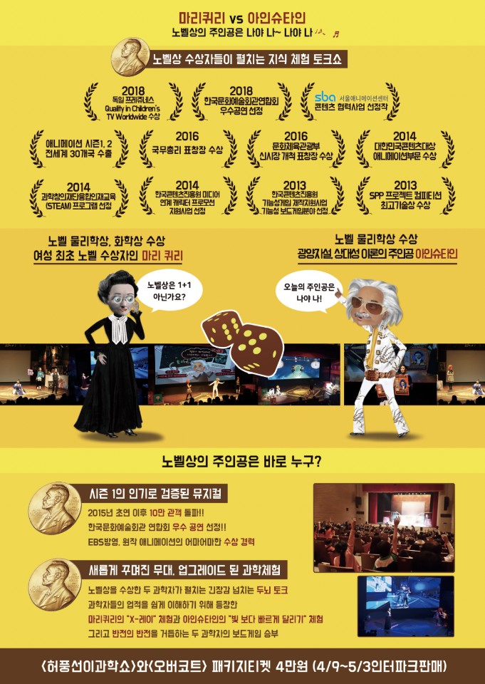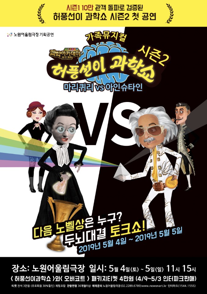 노원어울림극장에서 어린이날을 맞이하여 가족뮤지컬 "허풍선이 과학쇼" 를 진행합니다. 아이들이 놀면서 배울 수 있는 체험형 공연입니다. 어린이날 아직 계획이 없으시다면 가까운 어울림극장으로 나들이는 어떠실까요~ ▶ 공연일정 : 2019. 5. 4.(토) ~ 5. 5.(일) 11:00, 15:00 ▶ 공연장소 : 노원어울림극장▶ 티켓가격 : 전석 3만원(※ 체험포함)▶ 관람연령 : 36개월 이상▶ 문의 : ☎ 02-2289-6789