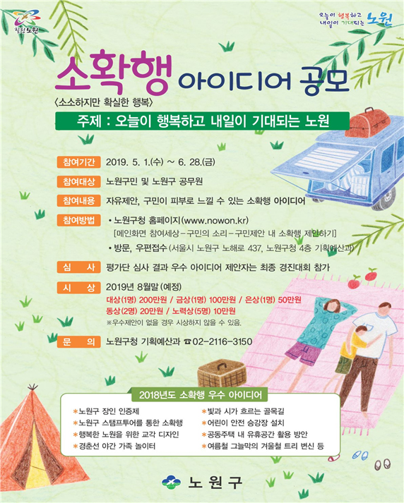 오늘이 기대되고 내일이 행복한 노원을 만들어 갈 "소확행(소소하지만 확실한 행복) 아이디어" 를 모집하오니 구민여러분의 많은 관심과 참여를 부탁드립니다.