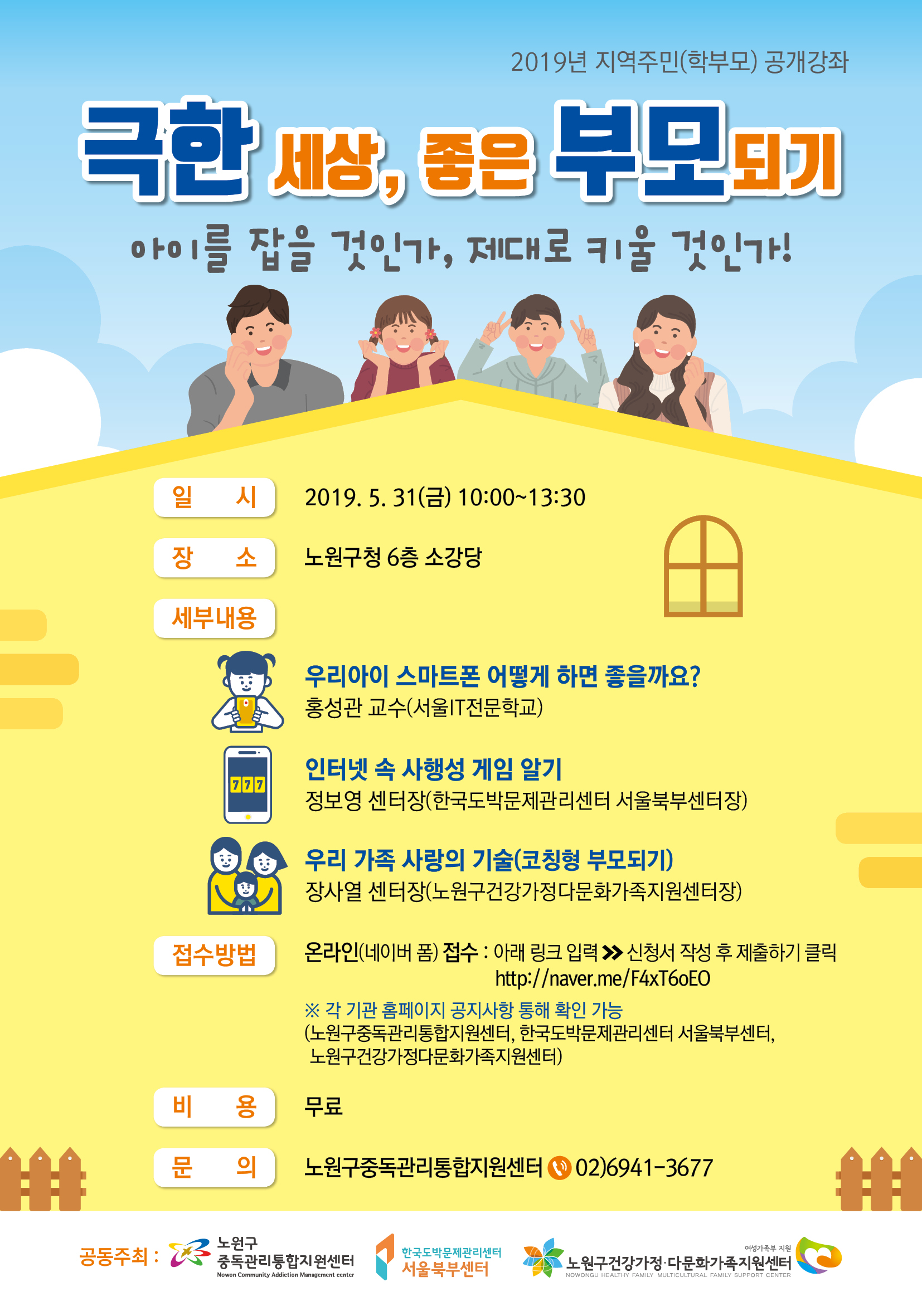 ▶ 일시 : 2019. 5. 31.(금) 10:00 ~ 13:30 (※ 1부, 2부 운영)▶ 장소 : 노원구청 6층 소강당▶ 대상 : 자녀의 과도한 핸드폰 사용, 게임문제를 고민하고 계신 학부모 등 ▶ 주관 : 노원구다진센터 (노원구중독관리통합지원센터)▶ 신청 : 네이버폼 접수 (신청서 작성 후 제출하기 클릭)▶ 문의 : 노원구중독관리통합지원센터 ☎ 02-6941-3677☞ 신청하기 (클릭하세요)