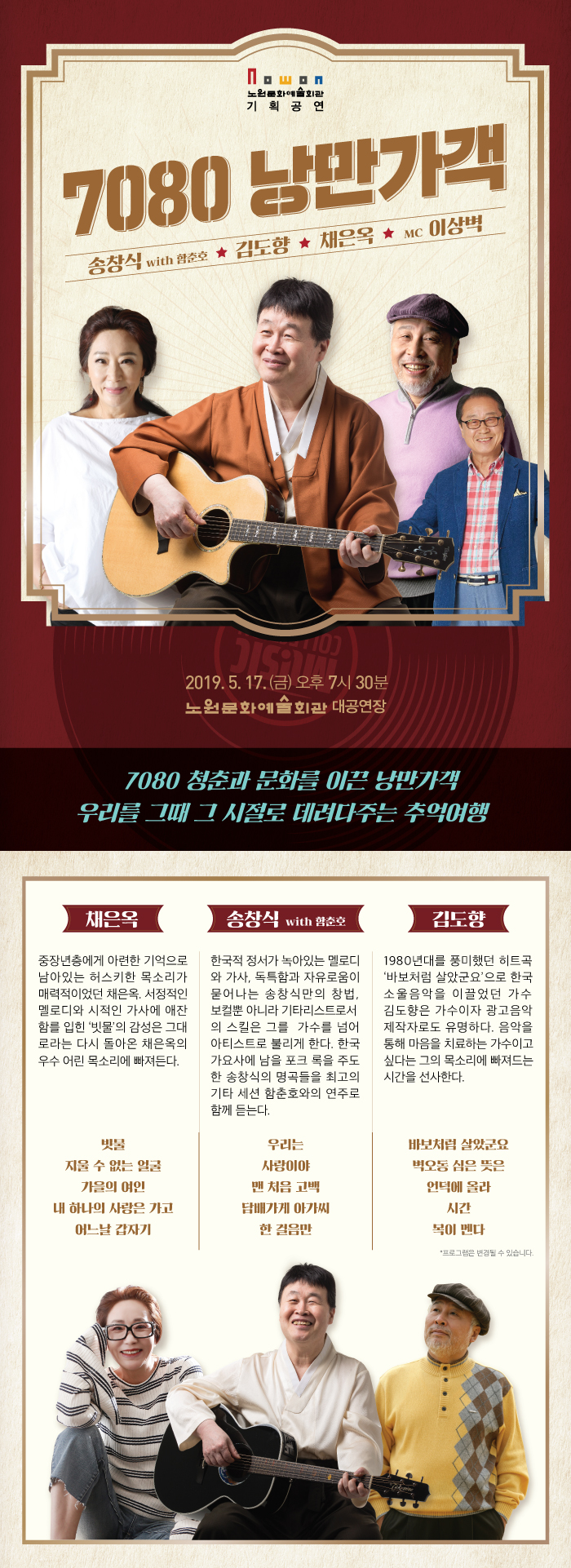 ▶ 일시 : 2019. 5. 17.(금) 19:30 ▶ 장소 : 노원문화예술회관 대공연장▶ 티켓 : R석 6만원, A석 4만원▶ 장르 : 콘서트/대중음악/포크▶ 관람연령 : 8세 이상▶ 문의 : 노원문화예술회관 ☎ 02-2289-6830