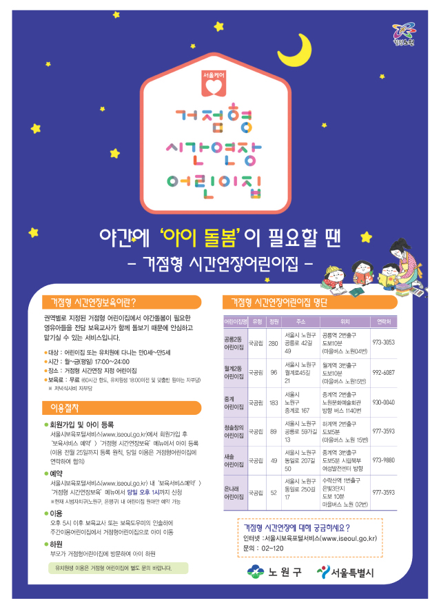 ▶ 신청방법 : 서울시보육포털서비스( iseoul.seoul.go.kr )에서 거점형 시간연장 보육서비스 예약