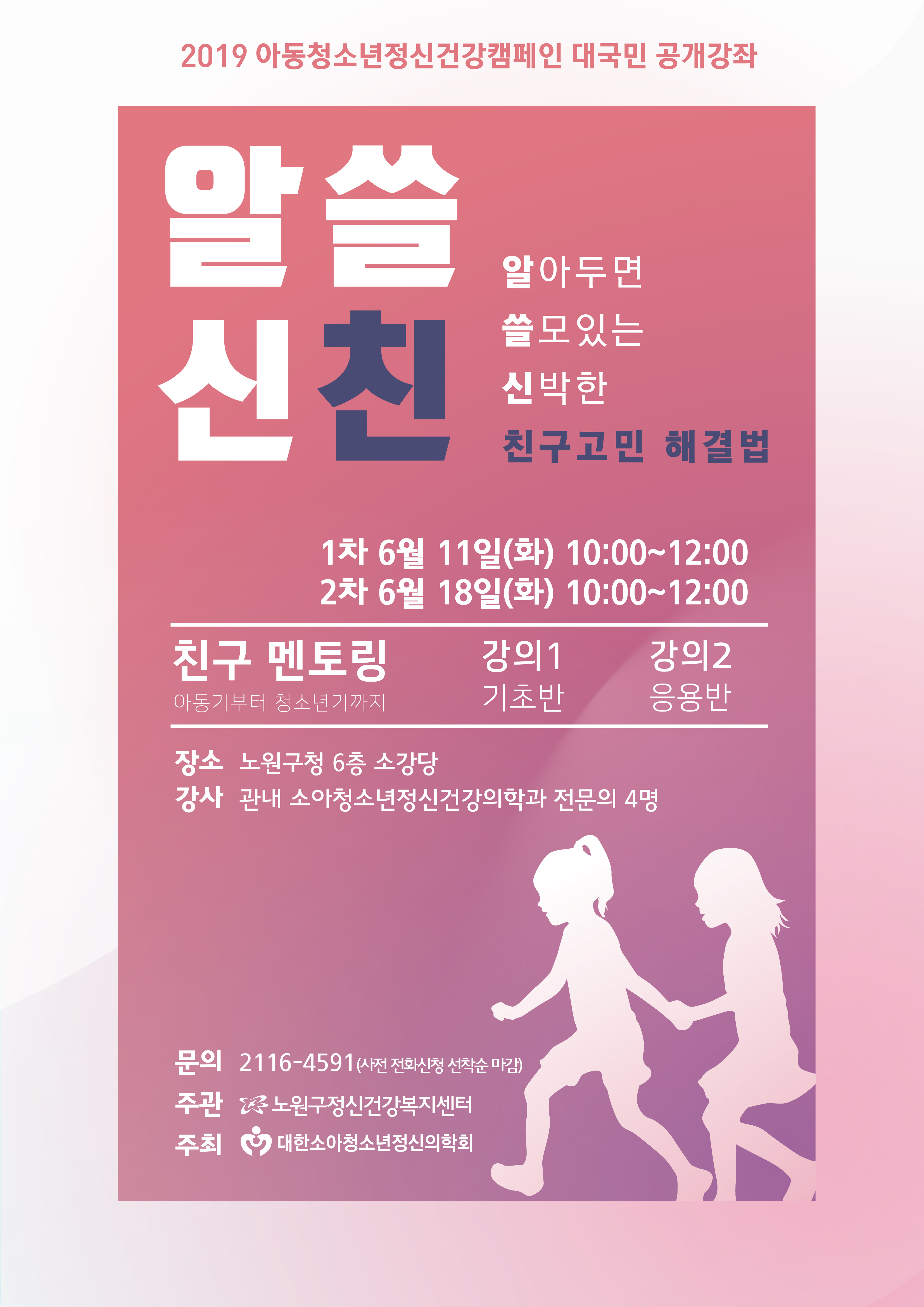 노원구정신건강복지센터에서는 대한소아청소년정신의학회와 함께 아동청소년의 정신건강을 위하여 『알아두면 쓸모있는 신박한 친구고민 해결법』 이라는 주제로 공개강좌를 개최하오니 많은 참여 부탁드립니다.