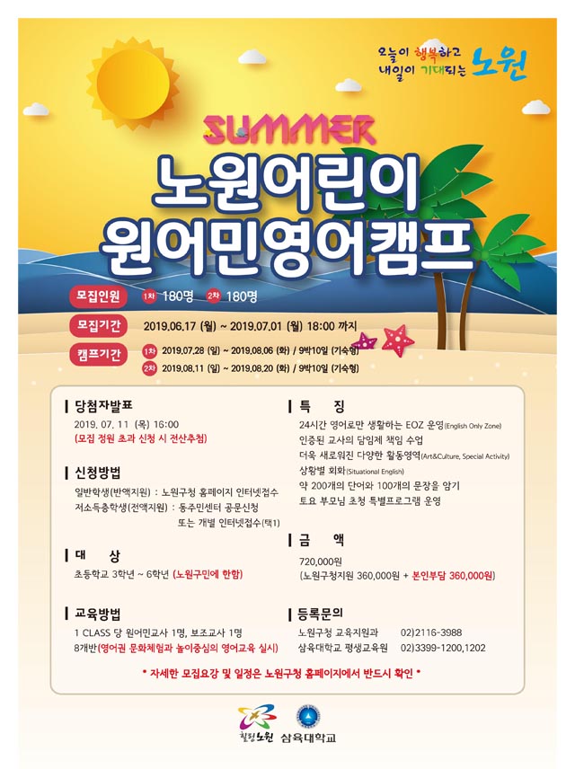 노원구에서는 여름방학을 맞이하여 관내 삼육대학교와 관학협력 사업으로 『2019학년도 여름방학 노원 어린이원어민 영어캠프』 를 개최합니다. 해외연수에 버금가는 영어환경에서 원어민 강사와 다양한 활동을 하며 영어를 학습할 수 있는 이번 행사를 통해 알차고 보람 있는 방학을 보내시길 바랍니다.