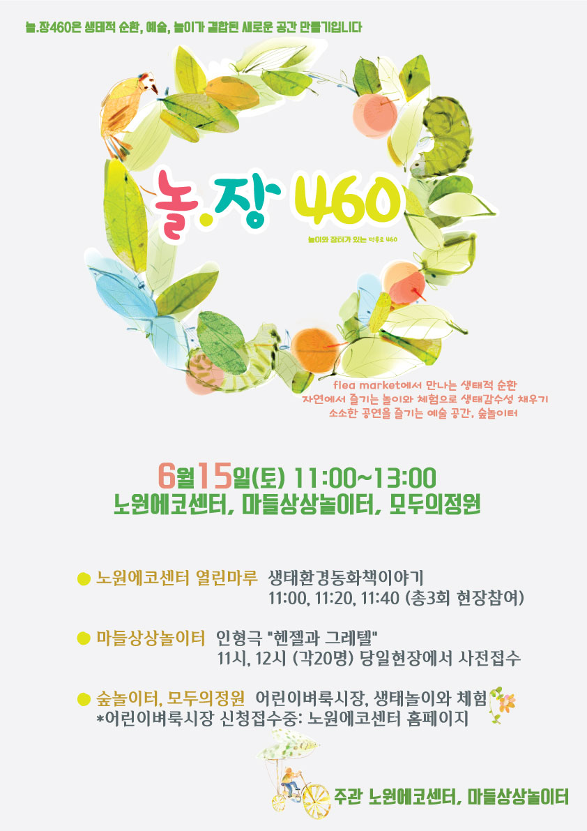 놀.장460 은 생태적순환, 예술, 놀이 가 결합된 새로운 공간만들기입니다.