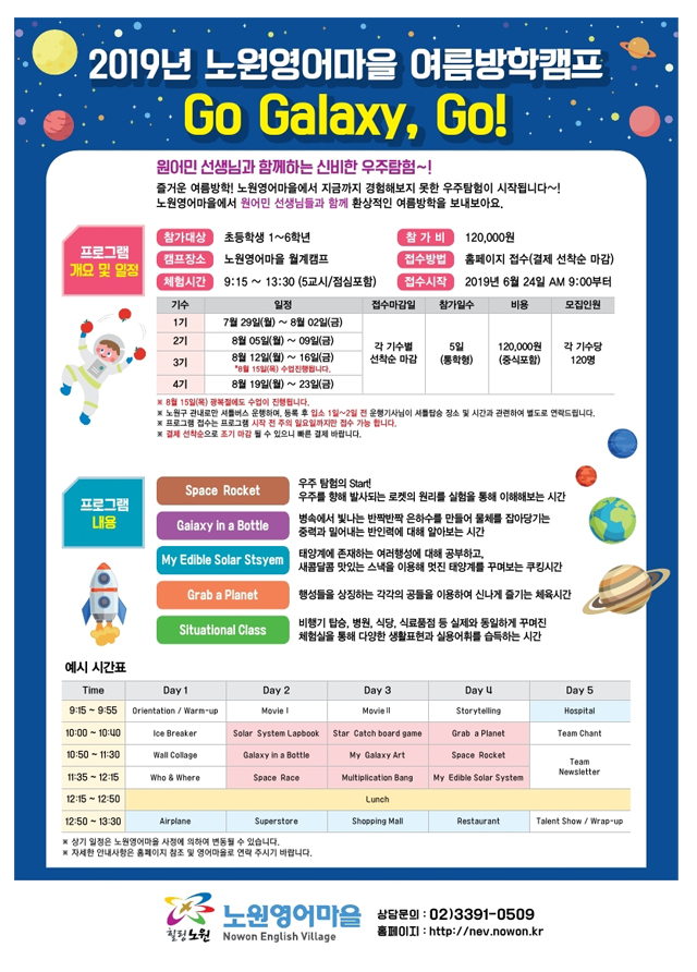 ▶ 신청기간 : 2019. 6. 24.(월) 9:00 ~ (※ 선착순 마감)▶ 대상 : 초등학생 1 ~ 6학년 (노원구 거주자에 한함)▶ 문의 : 노원영어마을 ☎ 02-3391-0509☞ 신청하기 (클릭하세요)