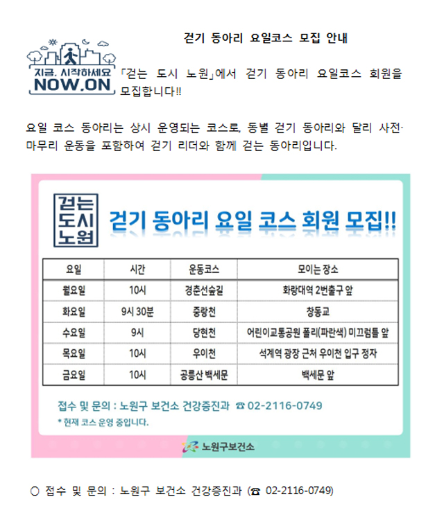 「걷는 도시 노원」 에서 걷기 동아리 요일코스 회원을 모집 합니다!  상시 운영 되는 코스로, 동별 걷기 동아리와 달리 사전·마무리 운동을 포함하여 걷기 리더와 함께 걷는 동아리 입니다. 관심있는 지역주민의 많은 접수를 바랍니다. (단, 운동이 시작는 시간은 변경될 수 있습니다.)