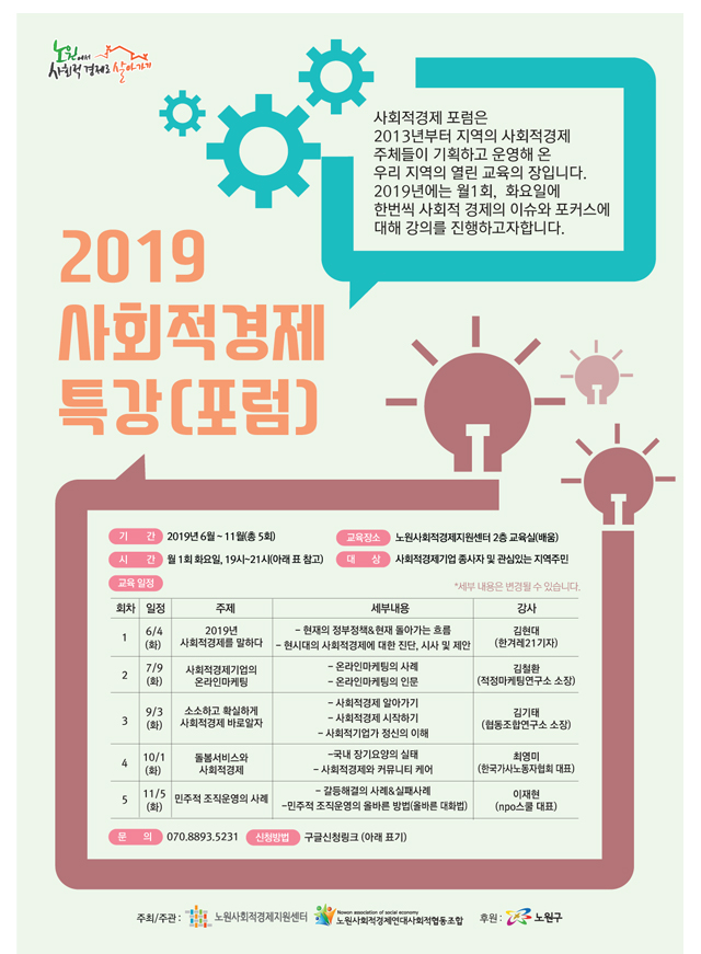 ▶ 일시 : 2019. 7. 9.(화) 19시 ~ 21시 ▶ 장소 : 노원사회적경제지원센터 2층 교육실 ▶ 강의 - 사회적경제기업의 온라인마케팅 - 온라인마케팅의 사례 - 온라인마케팅의 인문 ▶ 문의 : ☎ 070-8893-5231
