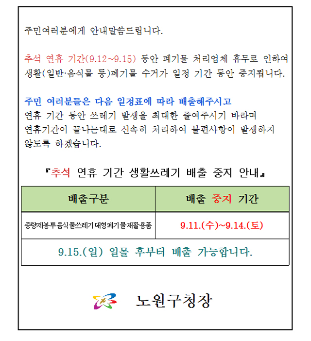▶ 배출 중지 기간 : 2019. 9. 11.(수) ~ 9. 14.(토)       [ ※ 9.15.(일) 일몰 후부터 배출 가능 ]