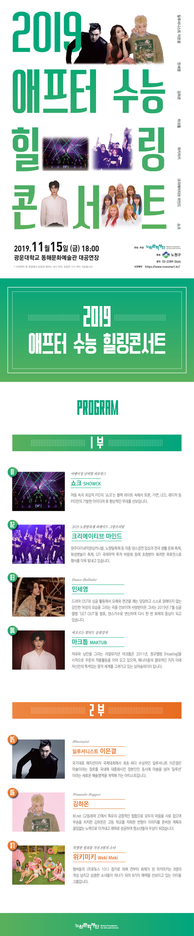 - 일루셔니스트 '이은결' 퍼포먼스 - 댄스 발라더 '민세영' - 떠오르는 발라드 음원강자 '마크툽' - 국내 레이저 트론댄스 최강자 '쇼크' - 워너비 래퍼 '김하온' - 화제의 아이돌 '위키미키' - 2019 노원탈축제 퍼레이드 그랑프리팀 '크리에이티브 마인드' |