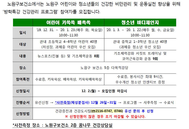 『방학특강 건강관리 프로그램』 대상자 모집