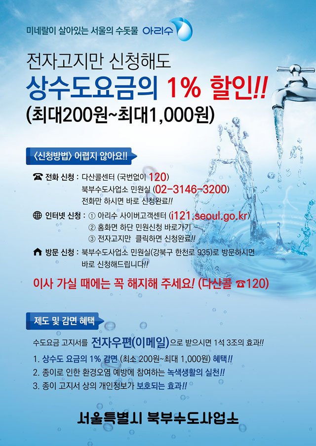 : 다산콜센터 ☎120 또는 북부수도사업소 민원실 ☎ 02-3146-3200