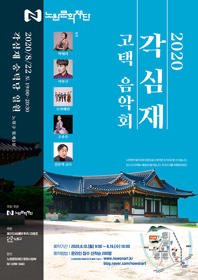 ▶ 일시 및 장소 : 8.22(토) 19:00 ~ 20:30, 각심재 숭덕당 일원(노원구 월계2동) ▶ 출연진 : 박애리, 이봉근, 두번째달, 조용주, 김준혁 교수▶ 예약방법 : 8.10(월) 09:00 ~ 8.19(수) 10:00, 온라인 접수 선착순 200명 ▶ 마스크 꼭 착용해주세요! ▶ 문의 : 노원문화재단 ☎ 02-2289-3463
