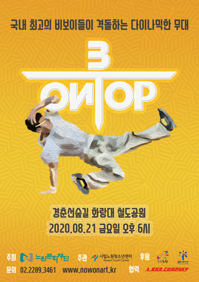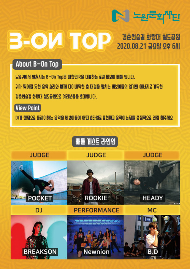 ▶ 일시 및 장소 : 8.21(금) 18:00 ~ 20:00, 경춘선숲길 화랑대 철도공원(노원불빛정원) ▶ 내용 : 2vs2 비보이 배틀대회, 게스트쇼, 심사위원 축하공연 등※ 코로나19에 따라 노원문화재단에서는 공연단체 및 스태프에 대한 방역을 철저히 준수합니다. 관객 마스크 미착용시 일회용마스크 무료 지급해 드립니다. ▶ 문의 : 노원문화재단 ☎ 02-2289-3461