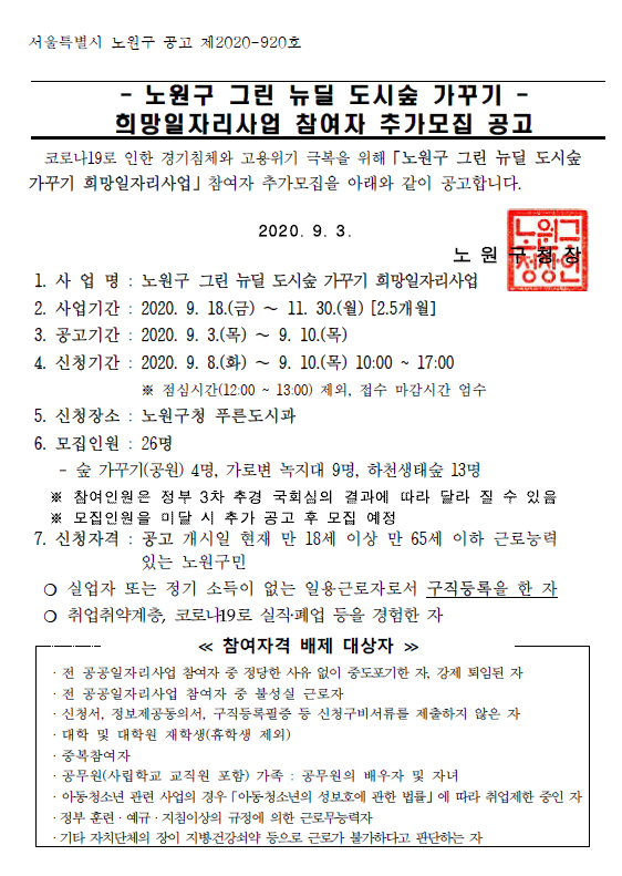 노원구 그린 뉴딜 도시숲 가꾸기 희망일자리사업 참여가 추가모집 안내