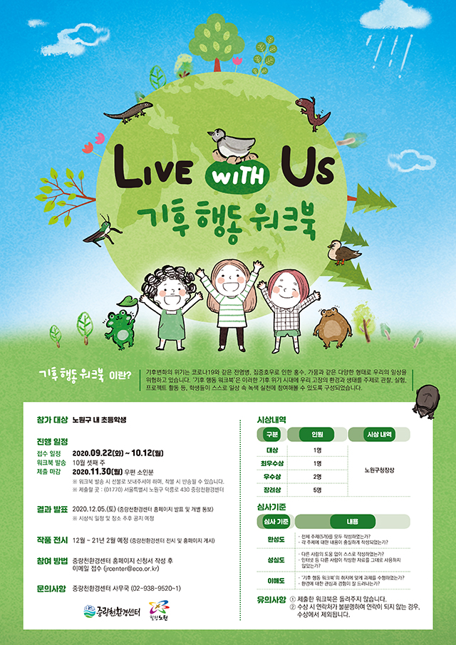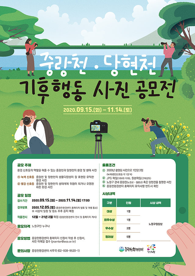 ▶ 응모대상 : 노원구민 누구나▶ 접수기간 : ~ 11.14.(토) 17:00 ▶ 공지사항 바로가기 ▶ 문의 : 중랑천환경센터 ☎ 02-938-9520 ▶ 응모대상 : 노원구 내 초등학생 (선착순 모집)▶ 접수기간 : ~ 10.12.(월) ▶ 공지사항 바로가기 ▶ 문의 : 중랑천환경센터 ☎ 02-938-9520