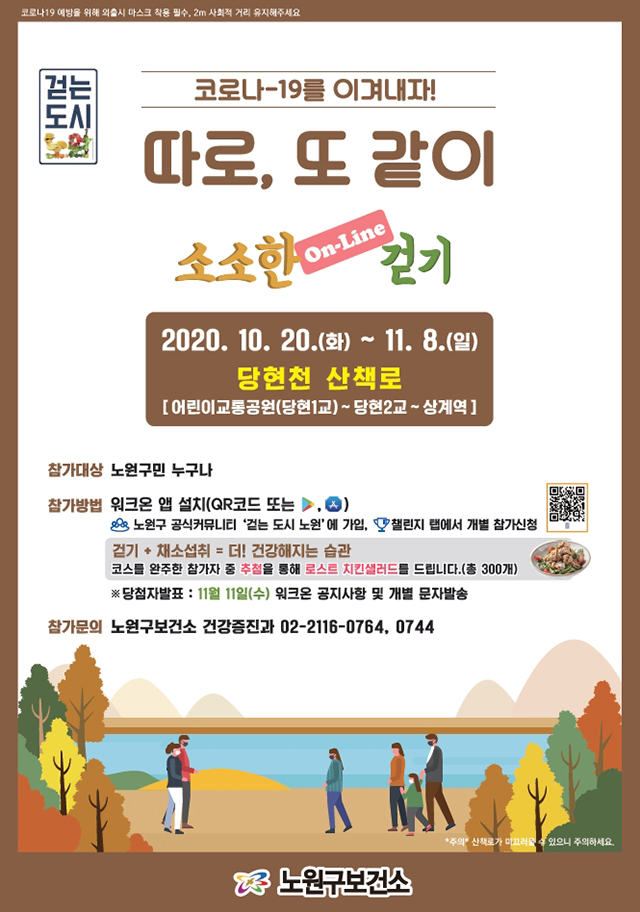 코로나19 예방을 위해 외출시 마스크 착용, 2m 거리두기 지켜주시며 당현천 산책로를 산책해보세요!